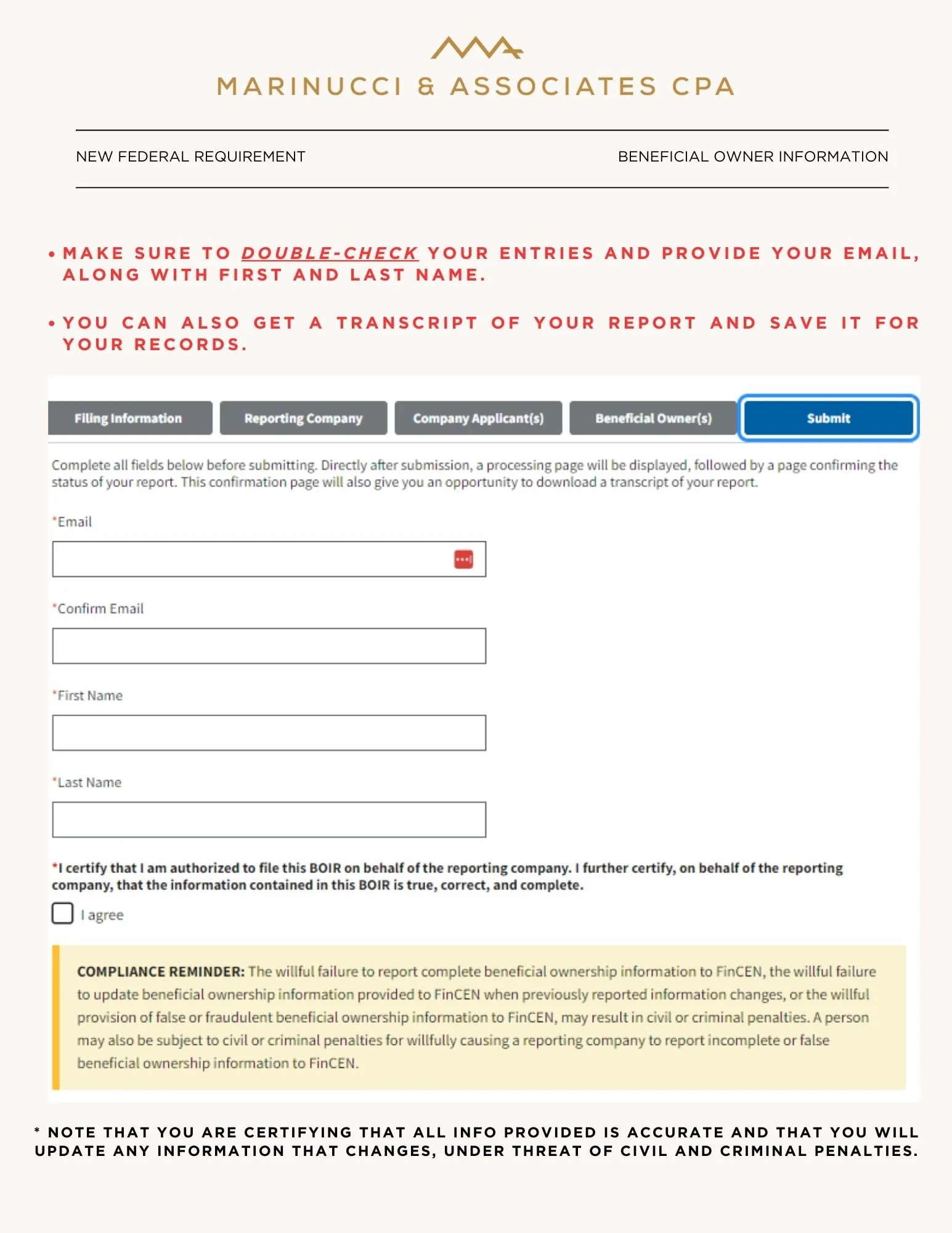 Beginning on January 1, 2024, many companies in the United States will have to report information about their beneficial owners, i.e., the individuals who ultimately own or control the company. They will have to report the information to the Financial Crimes Enforcement Network (FinCEN). Please follow this link to obtain additional information: https://www.fincen.gov/boi . Be sure to read through the FAQs (linked below) to see if you qualify for any of the exemptions to not file.